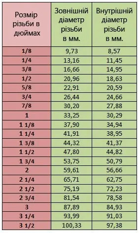Таблиця розмірів різьб: